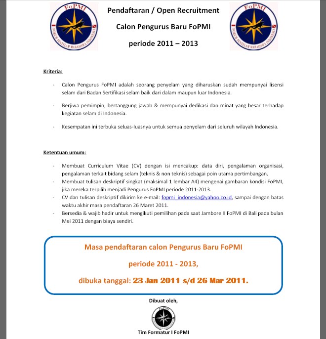 - Bersedia & wajib hadir untuk mengikuti pemilihan pada saat Jambore II FoPMI di Bali pada bulan Mei 2011 dengan biaya sendiri.